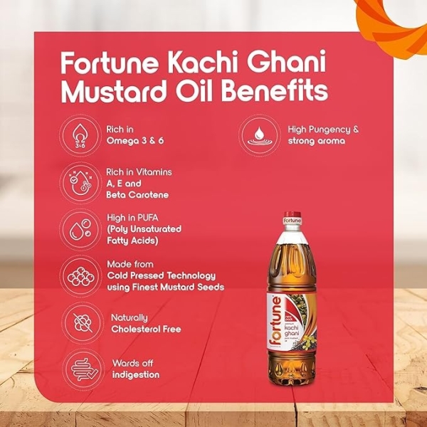 Fortune Premium Kachi Ghani Pure Mustard Oil, traditionally extracted from the first press of mustard seeds, comes with a high pungency level and strong aroma. Being pure, our cooking oil retains its natural properties and mustard oil benefits. Its strong aroma and pungency will spice up your cooking.