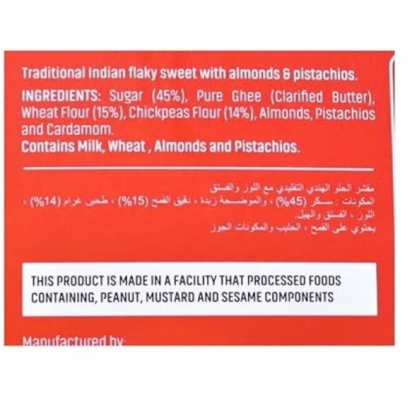 Ingredients: sugar, plant oil (palm olein) 25%, wheat flour, chickpea flour, cardamom, almonds, pistachios. Swedish: