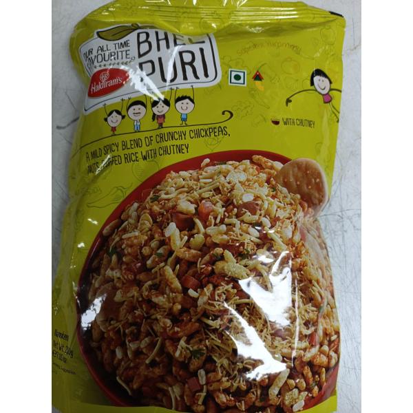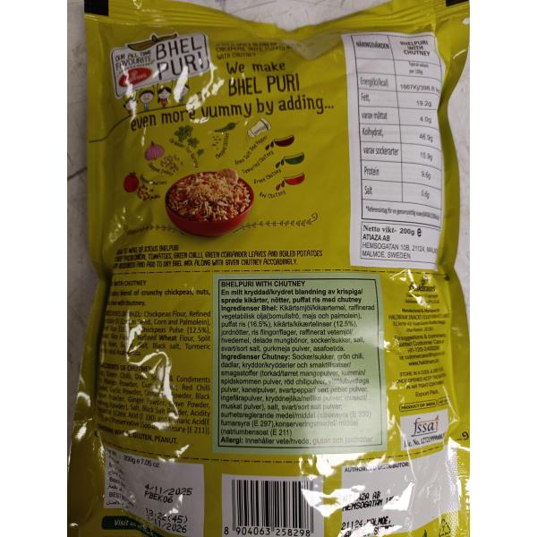 Puffat ris, ätbar vegetabilisk olja (palmolein, bomullsfrö eller majs), rostade jordnötter, kikärtsmjöl (besan), vetemjöl och kryddor. Paketet innehåller en torr sötsur chutneypåse gjord på socker, tamarind, dadlar, chili och kryddor.