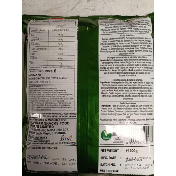 kikärtsmjöl, ätbar vegetabilisk olja (bomullsfrö, majs, palm/palmolein), salt och en kryddblandning. Viktiga kryddor inkluderar röd chilipulver, mangopulver, svartpeppar, spiskummin, kardemumma, kanel, koriander, muskotblomma och muskotnöt.