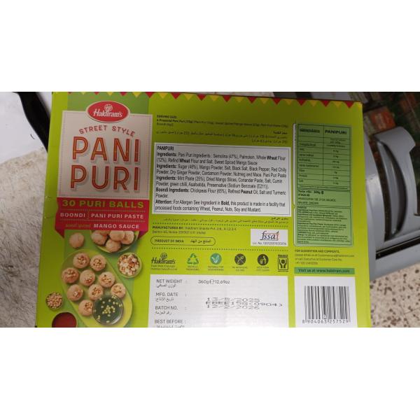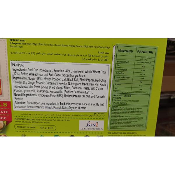 Ingredients: Pani puri: semolina (15%), whole wheat flour (6%) & palmolein. sweet spiced mango sauce: sugar (21%), mango