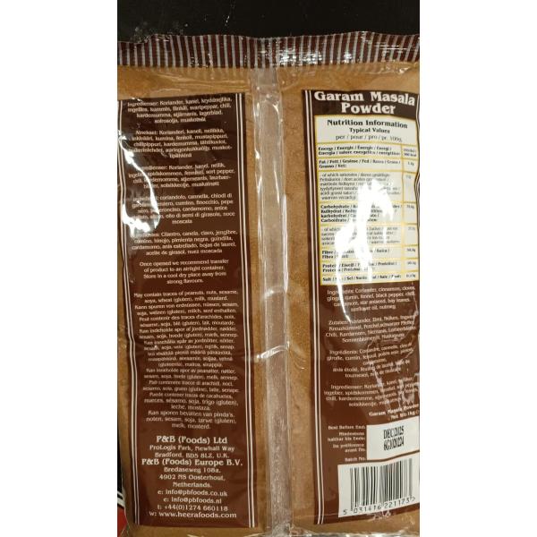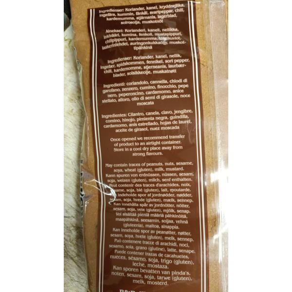 Ingredients: ground coriander, ground cumin, ground allspice, ground nutmeg, ground pepper, ground cardamom, ground cloves, ground fennel and bay leaves.